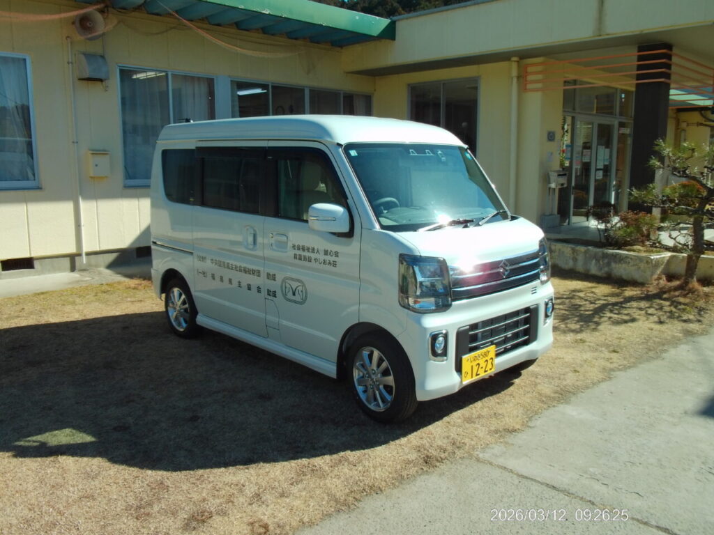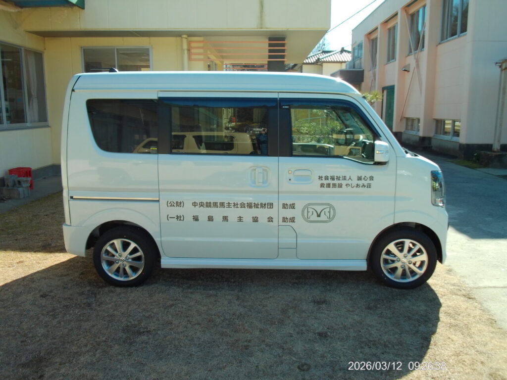 令和7年9月12日に令和7年中央競馬馬主社会福祉財団助成事業の交付が決定されました車いす移動車の更新事業(車名:スズキ・エブリー車いす移動車)につきまして、やしおみ荘に令和8年3月3日(火)納車いたしました。ご利用者様の足として、安心と快適性の向上が図られ、さらに生活の満足度を高めてまいりたいと思います。