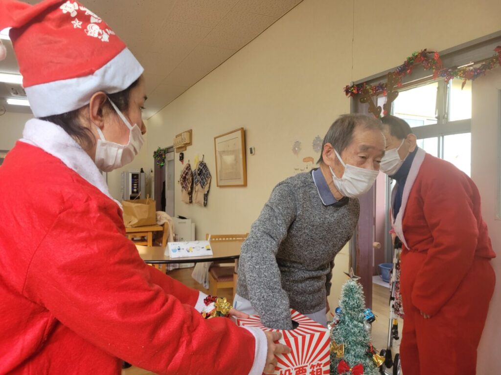 当日は利用者がサンタクロースやトナカイなどの衣装を着て司会やクリスマス会の運営を行い、クリスマスケーキを食したり、一緒にビンゴ・風船渡しゲームやクリスマスの歌をうたったりと、お招きした方と交流を図り、また一つ楽しい・嬉しい思い出が増えています。